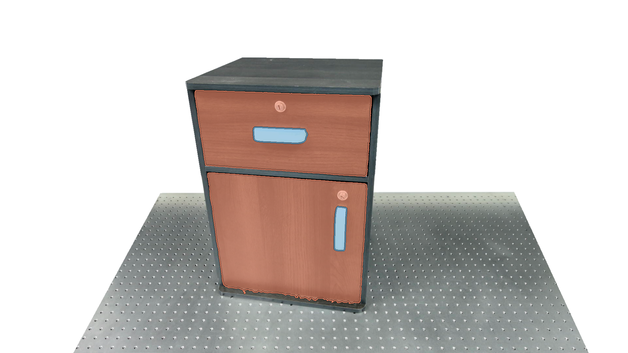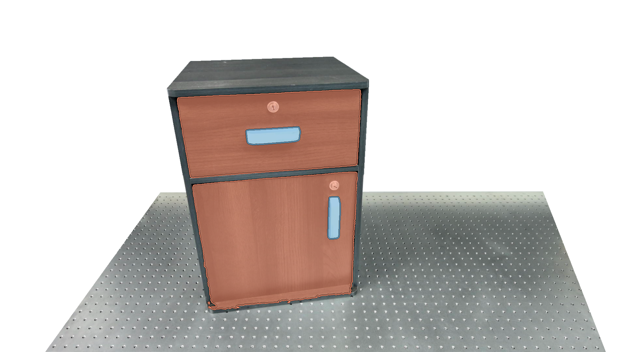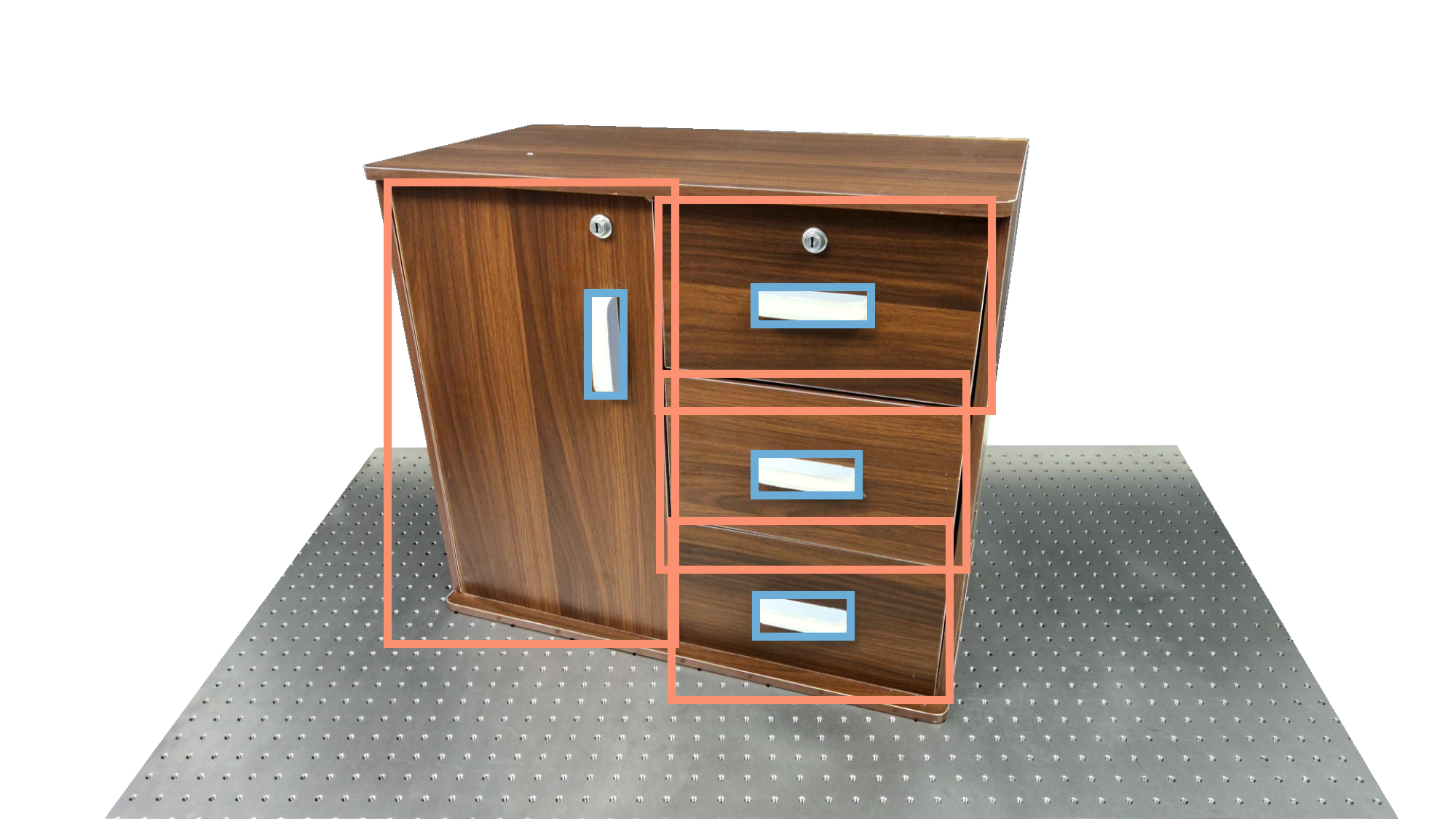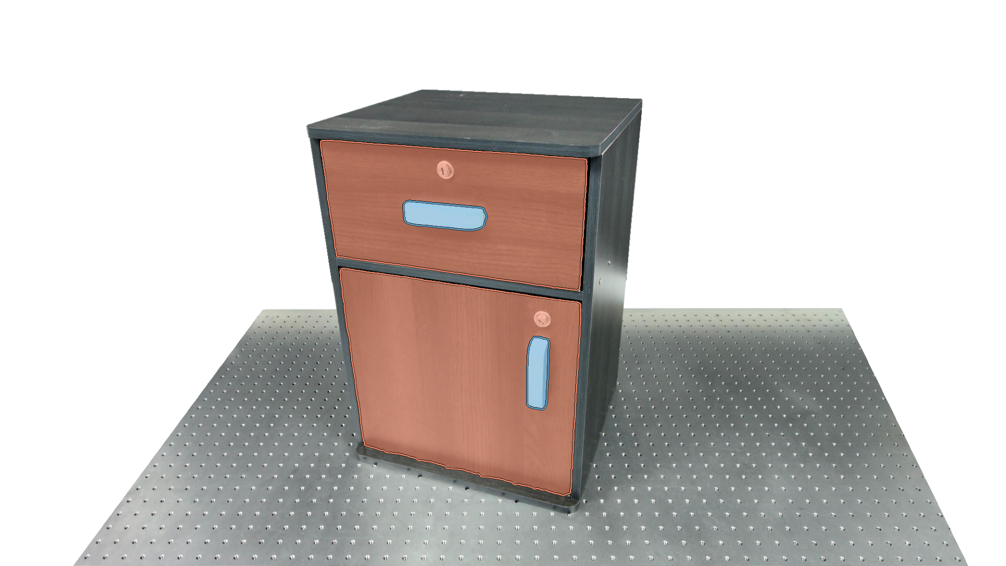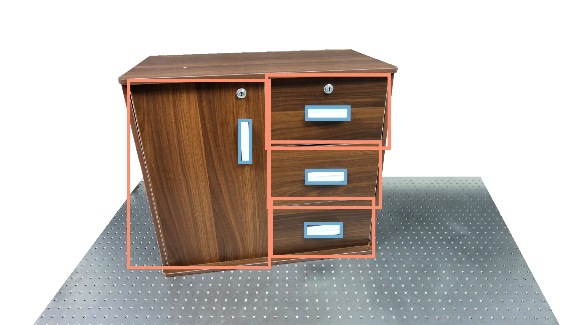 To identify holdable and movable regions, we first train a transformer-based detector that leverages DinoV3 visual features. The detector achieves a notably high mAP of 0.86 on the test set and generalizes seamlessly to real-world images. The model architecture and checkpoints are released with our code. The detection results are then used to prompt SAM2 for segmentation. In the following examples, blue indicates "holdable" parts, while orange indicates "movable" parts.