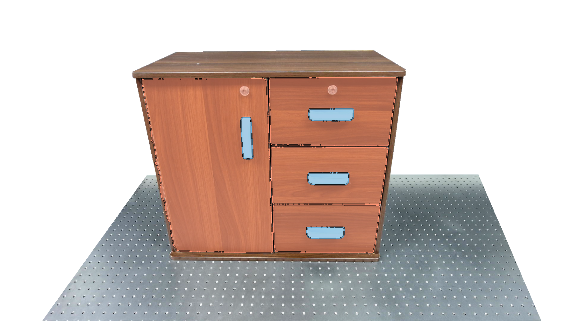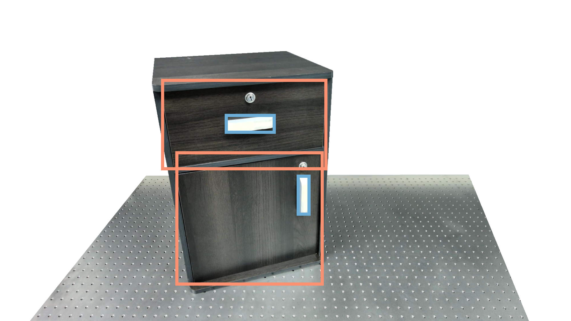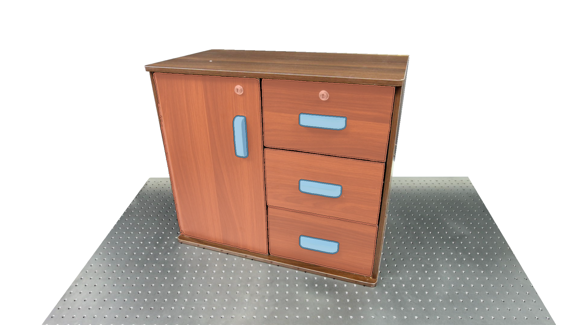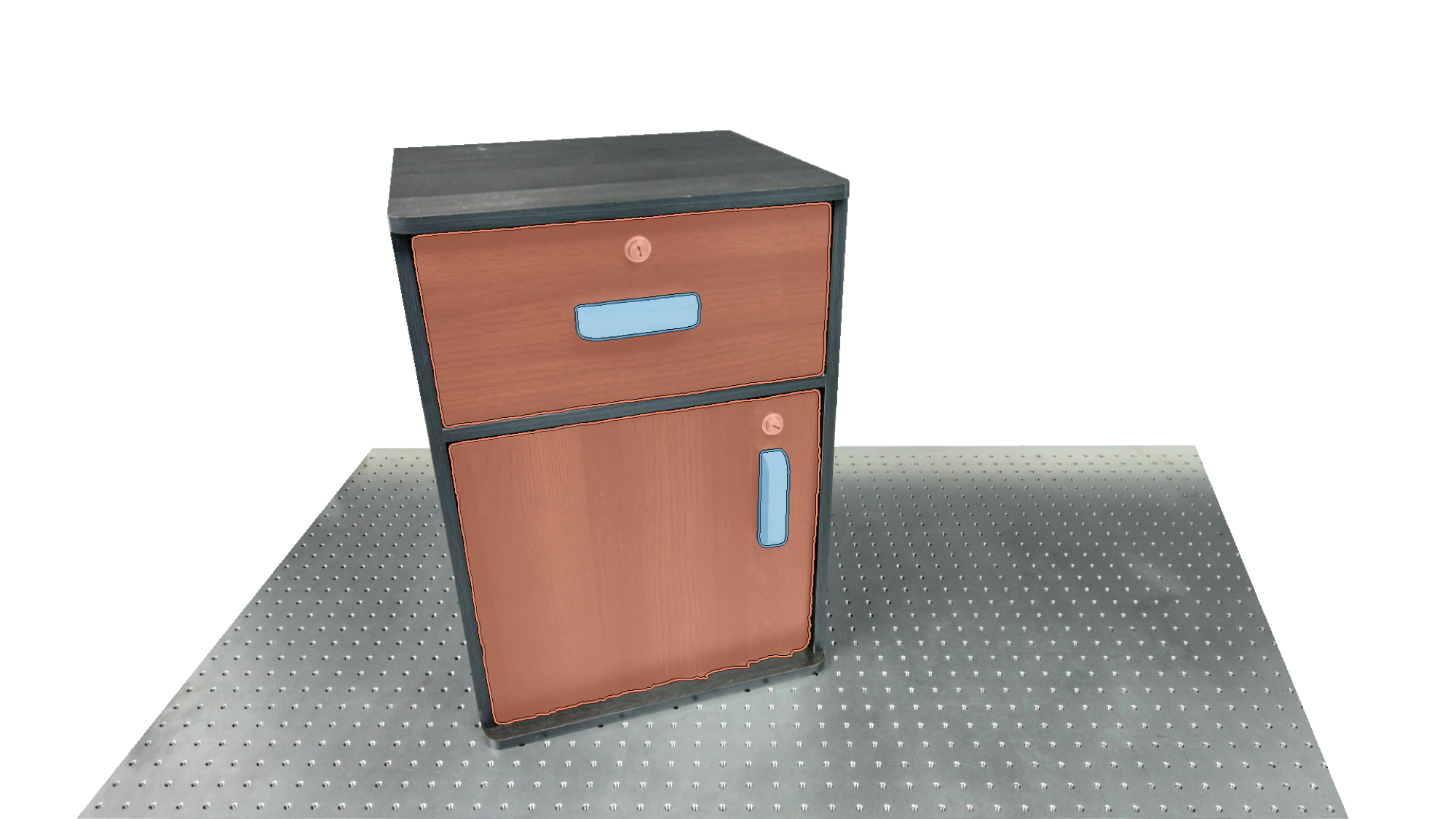 To identify holdable and movable regions, we first train a transformer-based detector that leverages DinoV3 visual features. The detector achieves a notably high mAP of 0.86 on the test set and generalizes seamlessly to real-world images. The model architecture and checkpoints are released with our code. The detection results are then used to prompt SAM2 for segmentation. In the following examples, blue indicates "holdable" parts, while orange indicates "movable" parts.