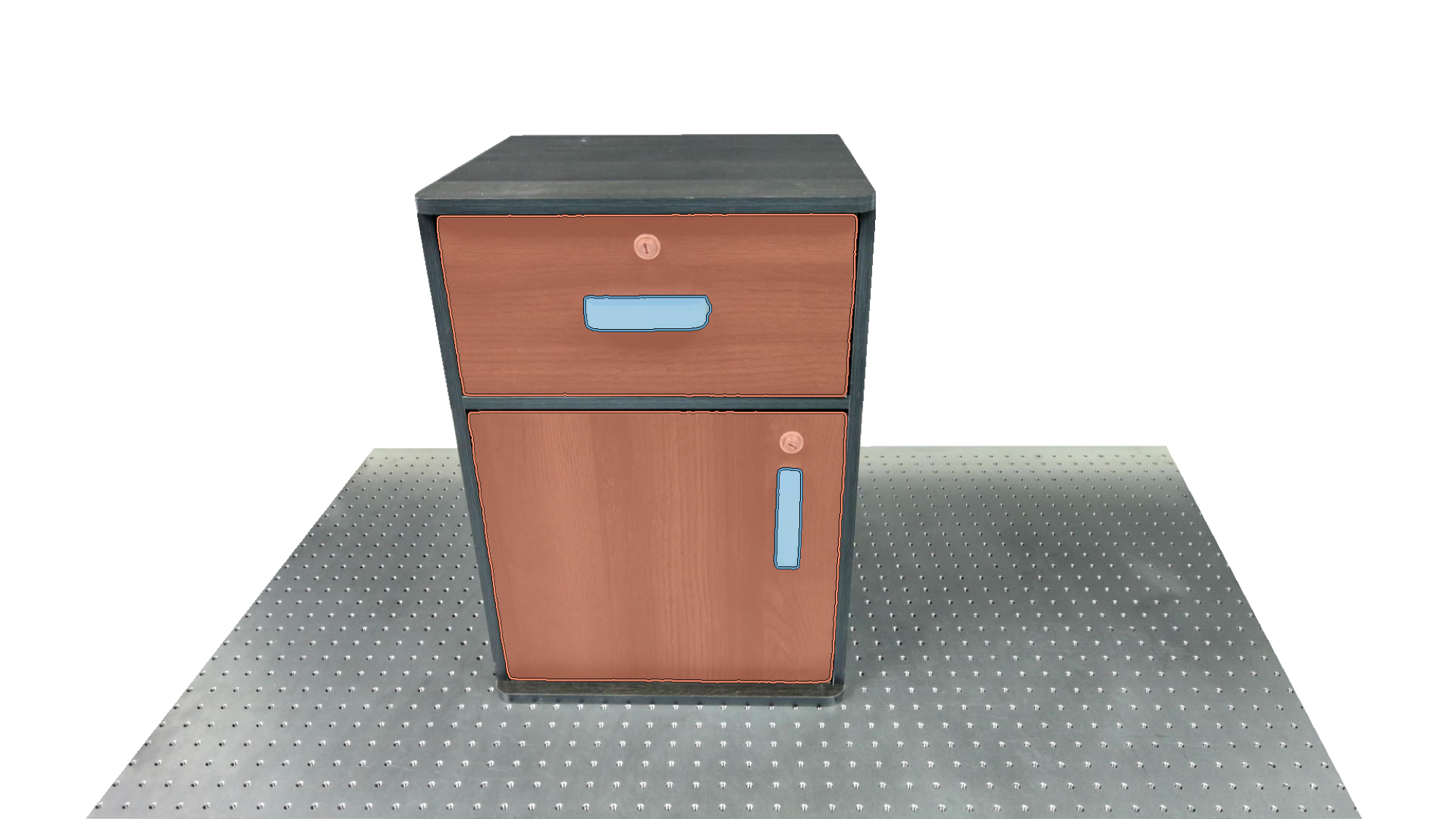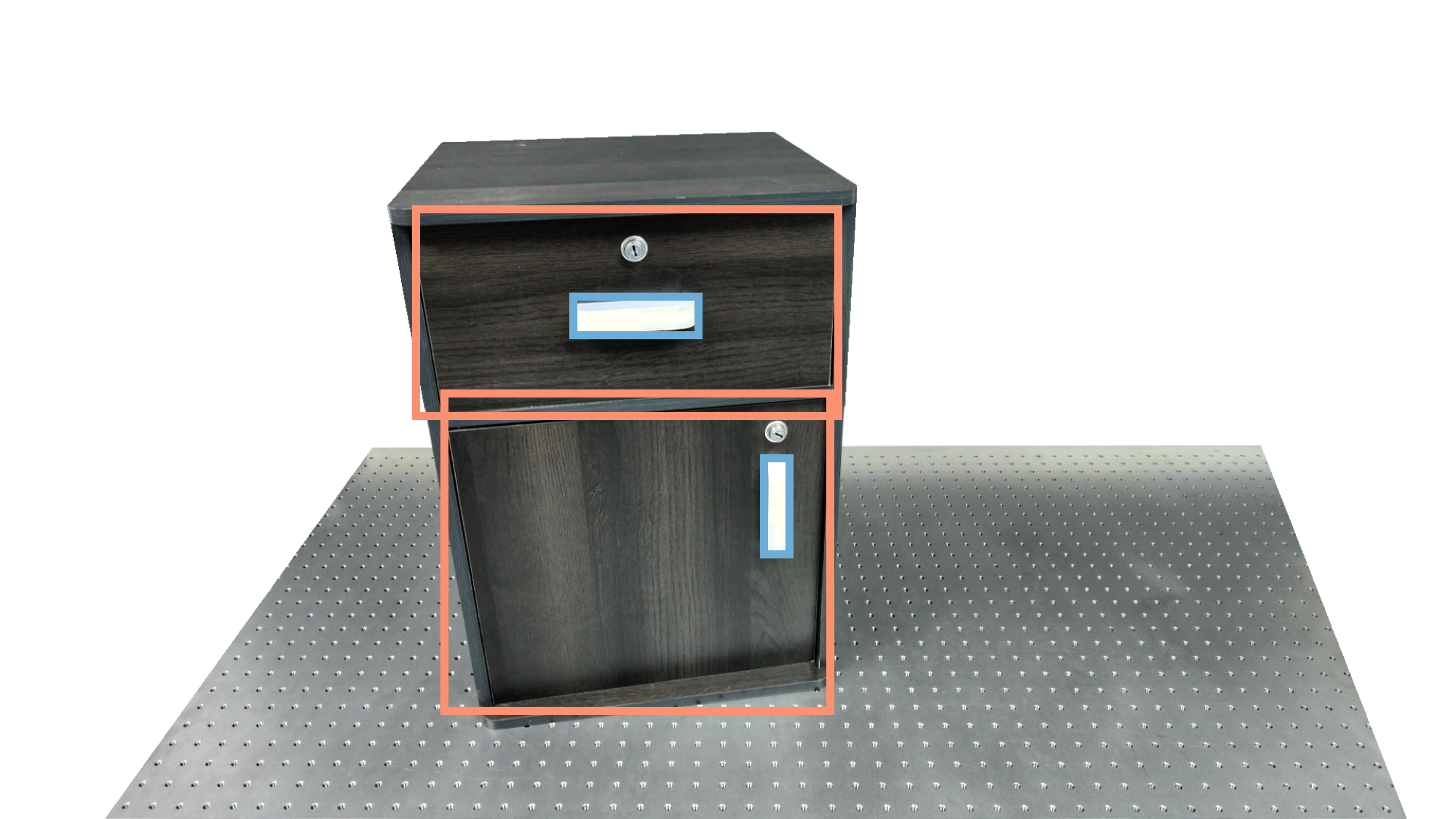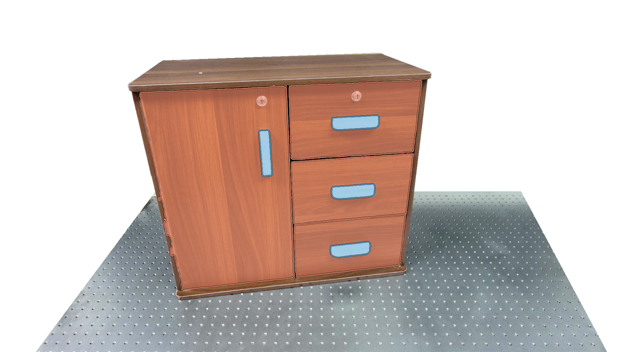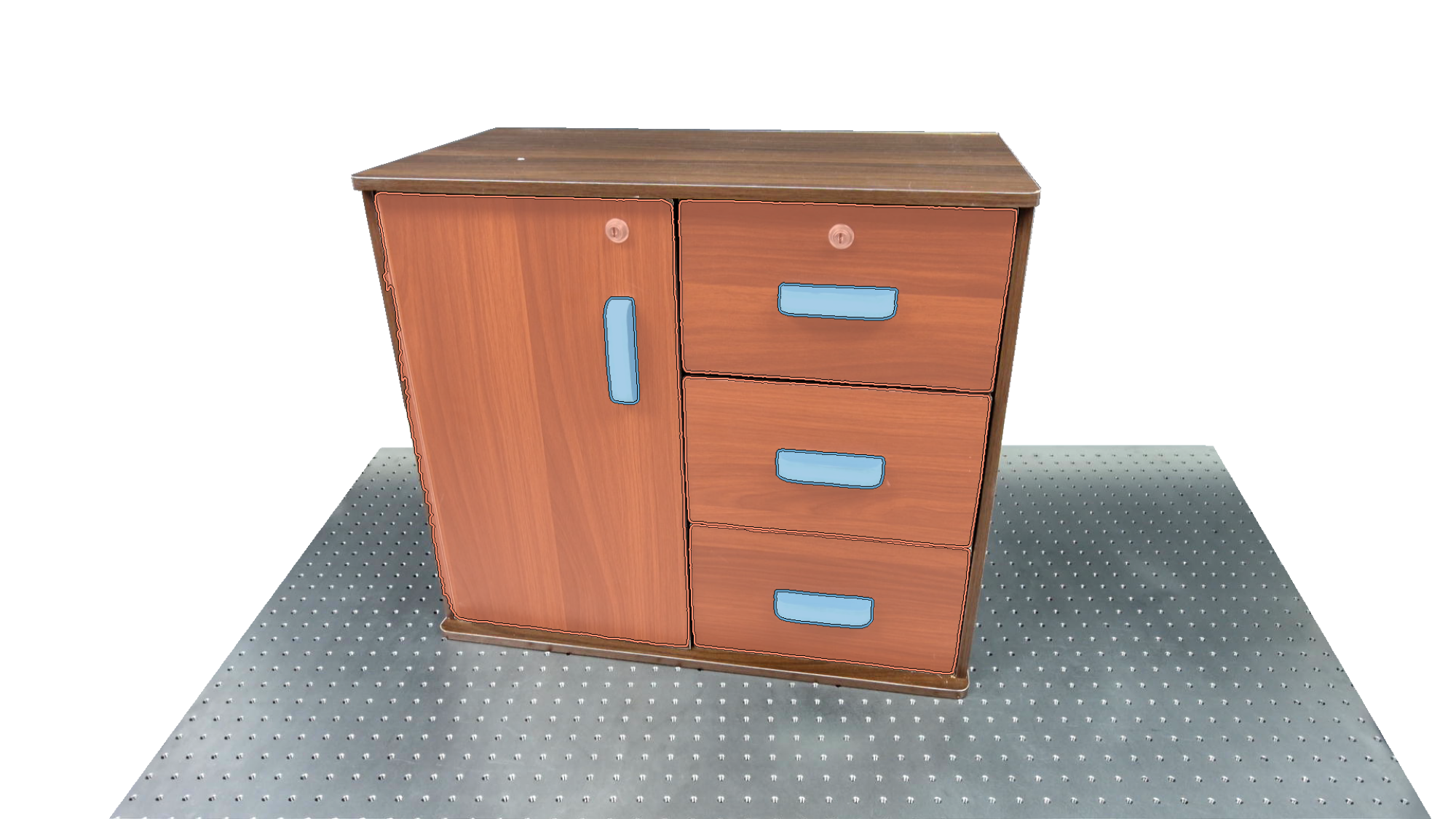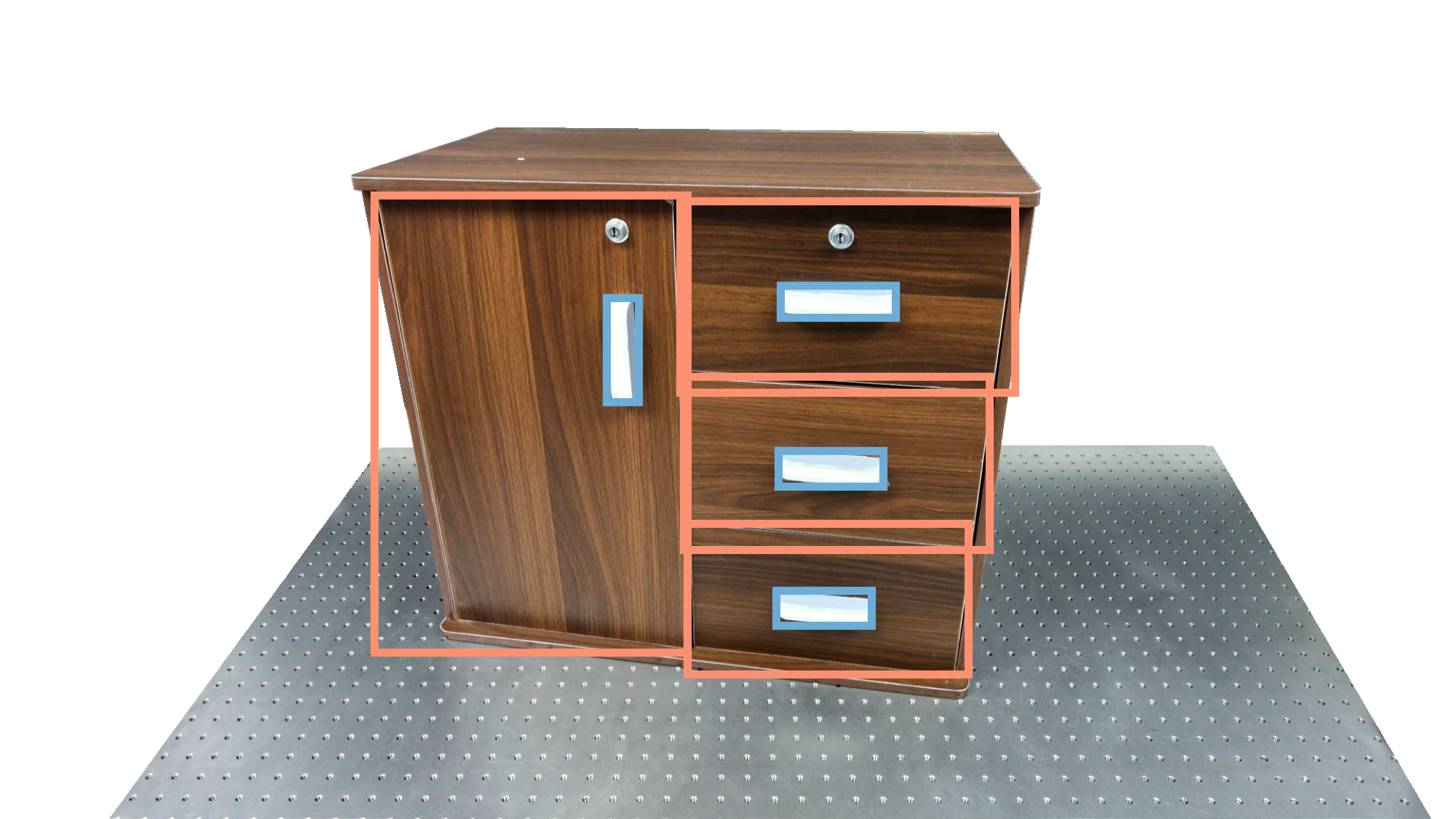 To identify holdable and movable regions, we first train a transformer-based detector that leverages DinoV3 visual features. The detector achieves a notably high mAP of 0.86 on the test set and generalizes seamlessly to real-world images. The model architecture and checkpoints are released with our code. The detection results are then used to prompt SAM2 for segmentation. In the following examples, blue indicates "holdable" parts, while orange indicates "movable" parts.