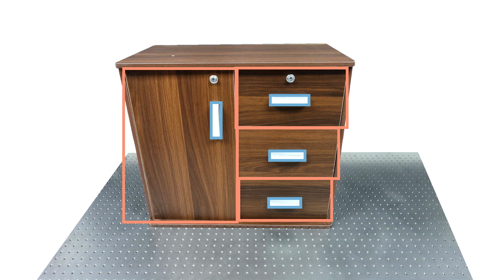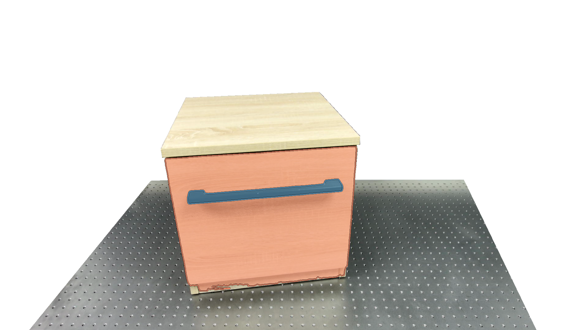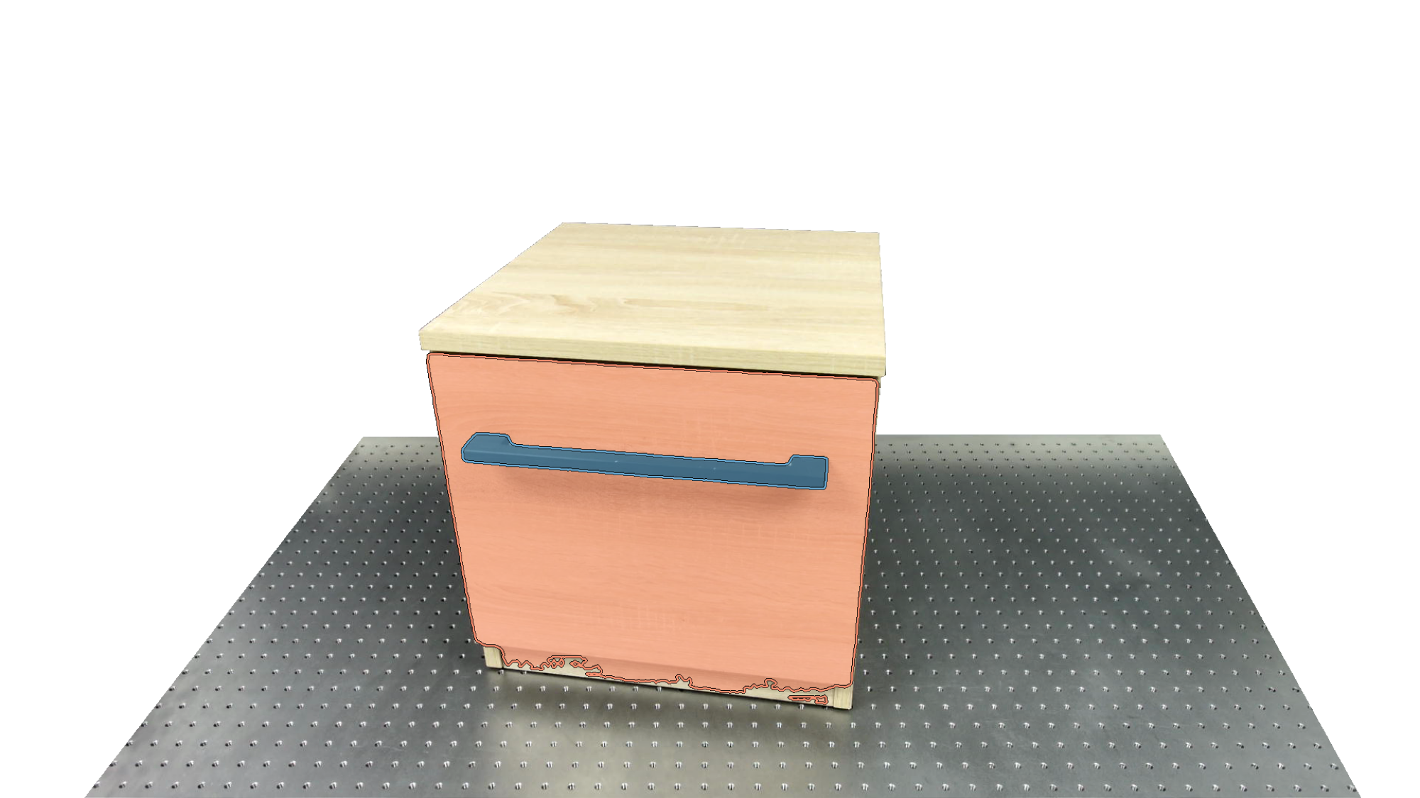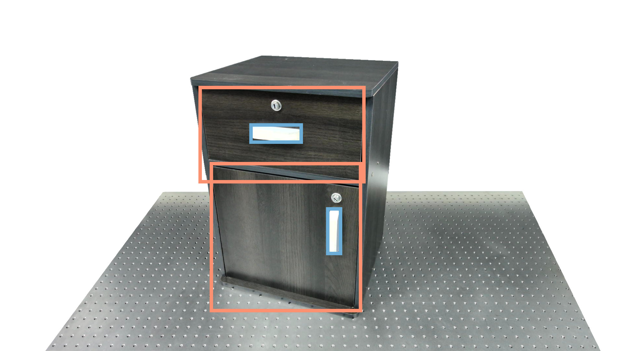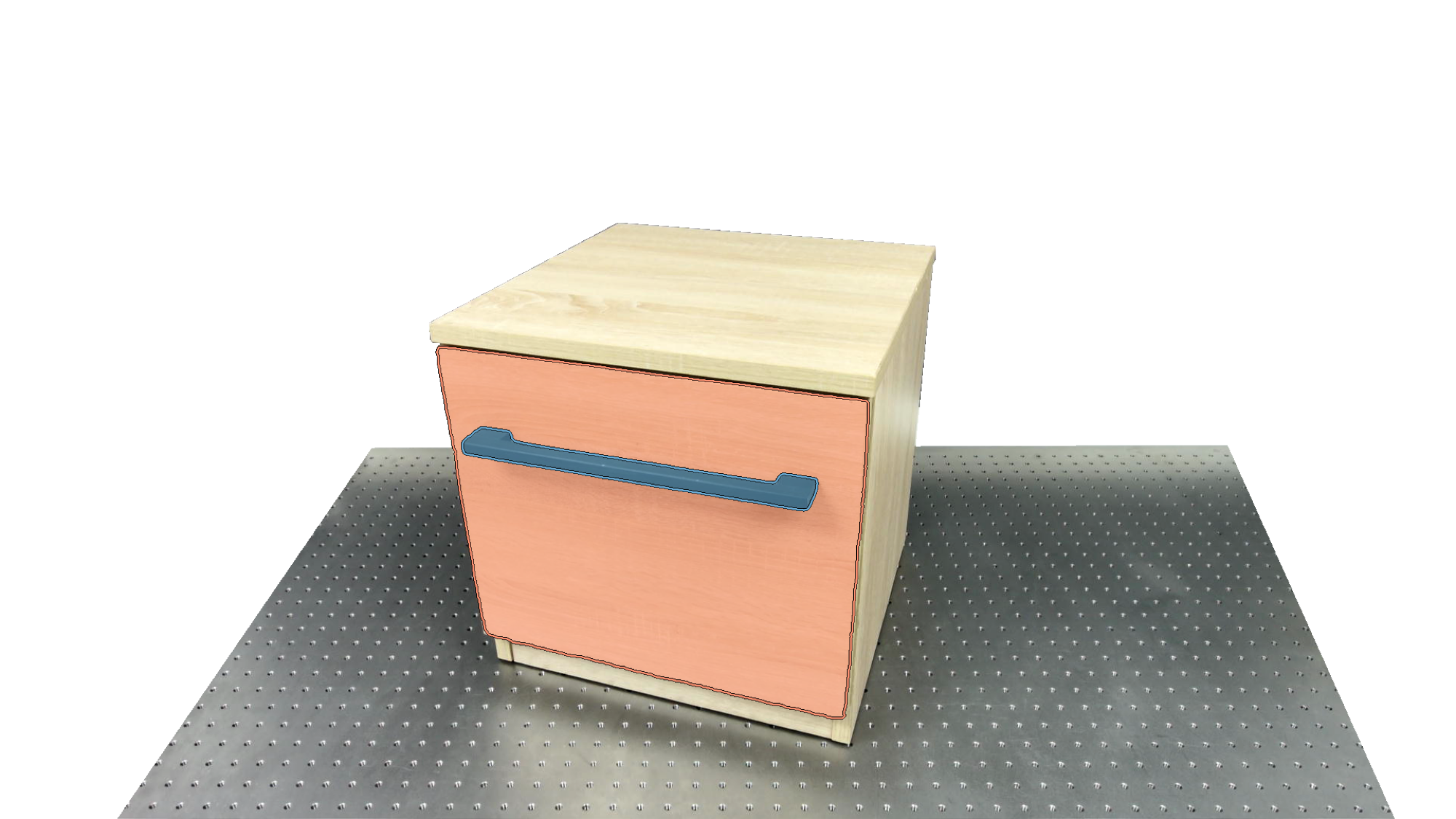To identify holdable and movable regions, we first train a transformer-based detector that leverages DinoV3 visual features. The detector achieves a notably high mAP of 0.86 on the test set and generalizes seamlessly to real-world images. The model architecture and checkpoints are released with our code. The detection results are then used to prompt SAM2 for segmentation. In the following examples, blue indicates "holdable" parts, while orange indicates "movable" parts.