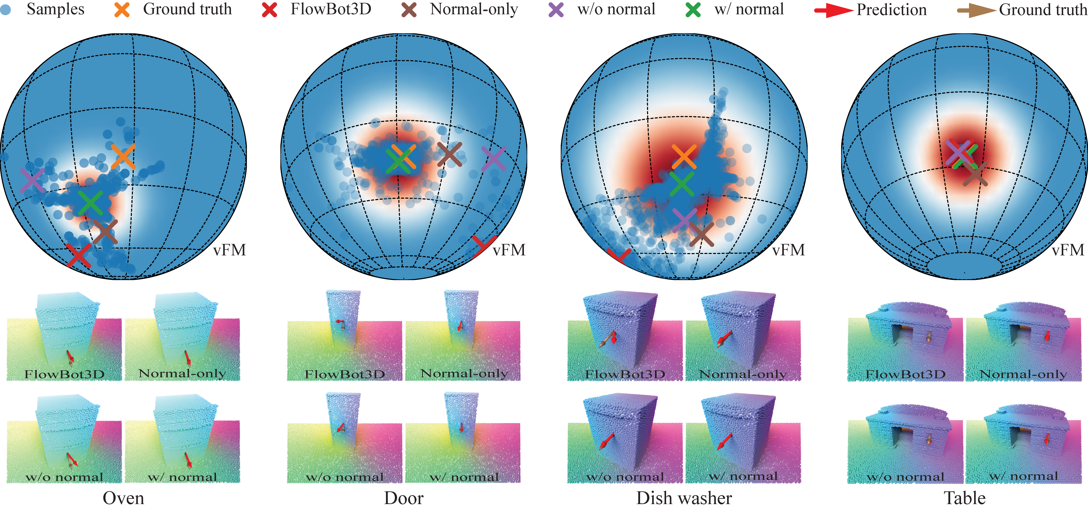 We model the distribution of interaction directions given visual observations by sampling different point groups in the movable region and inferring the corresponding point displacements after a small perturbation. Each group yields a rigid transformation that, combined with the selected grasping point, converts to a possible direction. In the ideal case, all directions would equal the ground truth and the distribution would degenerate to a Dirac delta function. However, due to uncertainty in visual observations, the directions are typically scattered around the ground truth. We fit a von Mises-Fisher (vMF) distribution to these samples to model this uncertainty, where the mean direction achieves the highest probability density. In practice, we compute the Fréchet mean of the sampled directions under the geodesic metric (arc length) on the sphere, yielding an unbiased estimator of the mean.