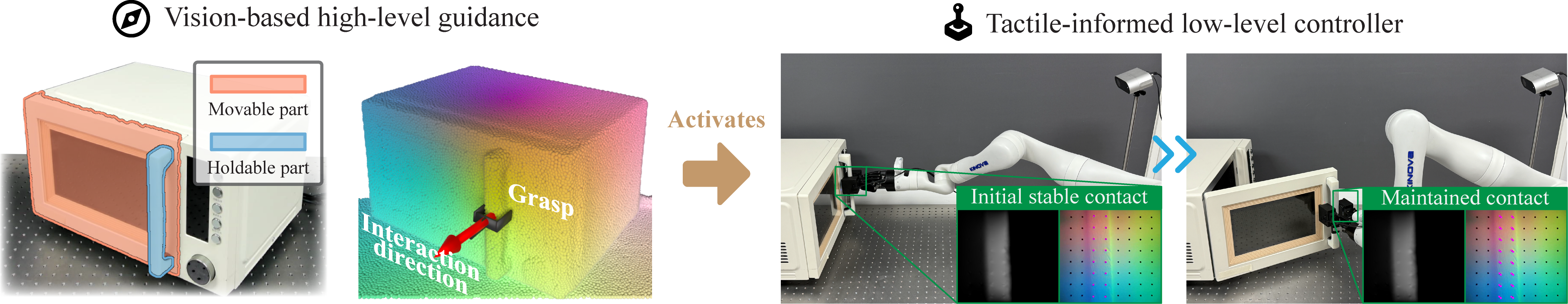 When manipulating a previously unseen articulated object placed at a random position, the Vi-TacMan framework begins by capturing an RGB-D image of the scene. Utilizing its global receptive field, the vision module identifies holdable and movable parts, segments them from the surrounding environment, and proposes both a feasible grasp configuration and a coarse motion direction. These visual cues provide sufficient information for the tactile-informed controller to establish stable contact with the object. Guided by the inferred motion direction, the controller maintains this stable contact throughout the manipulation process, ensuring precise and robust execution.